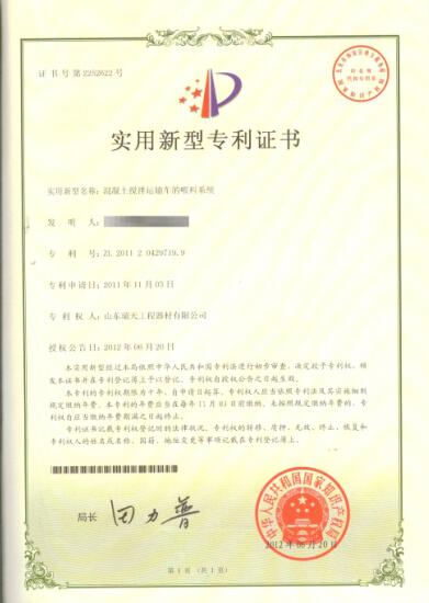 • 混凝土攪拌運輸車實用新型專利證書